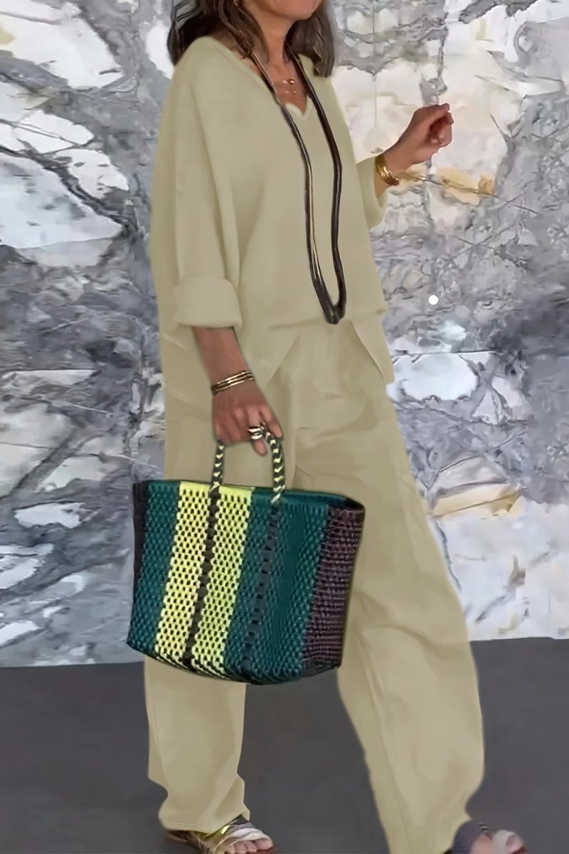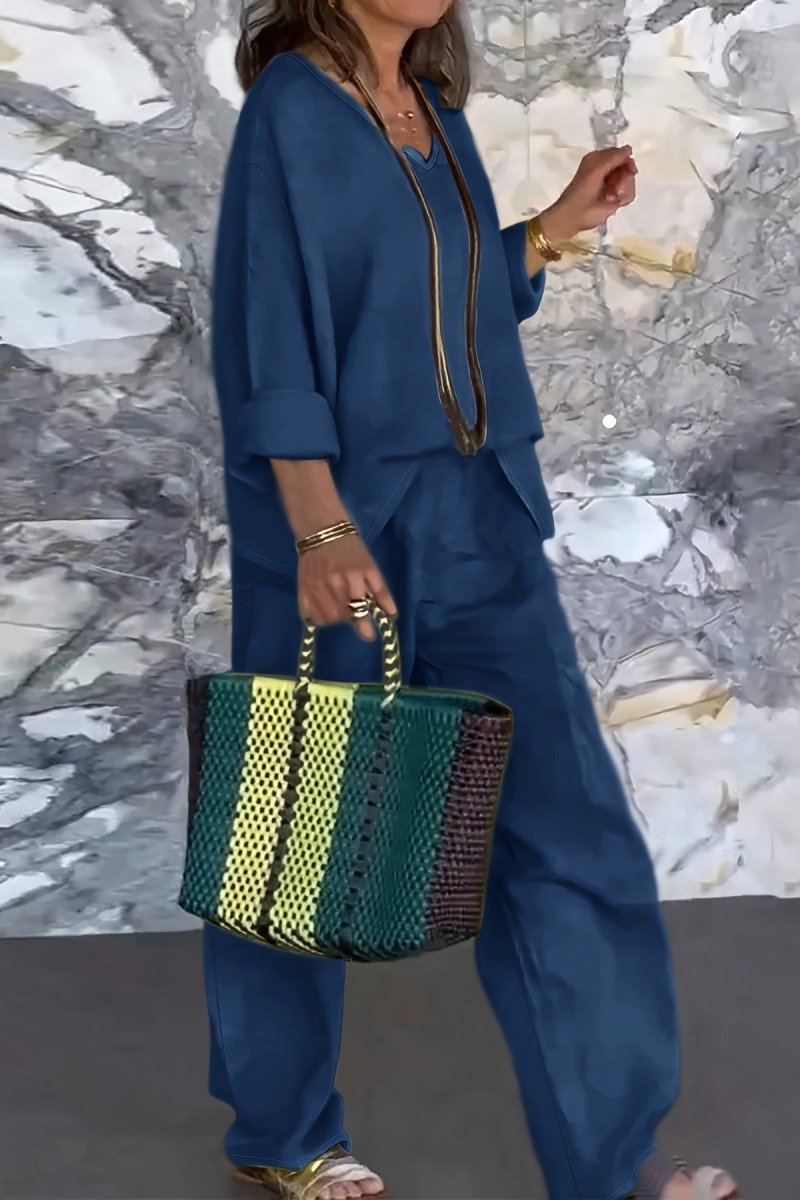 Wear the full set for a clean, coordinated look or style the top with denim for casual charm. Pair the loose pants with a fitted tank or blouse for a balanced silhouette. Finish with sandals for daytime ease or minimal heels for an elevated touch.
