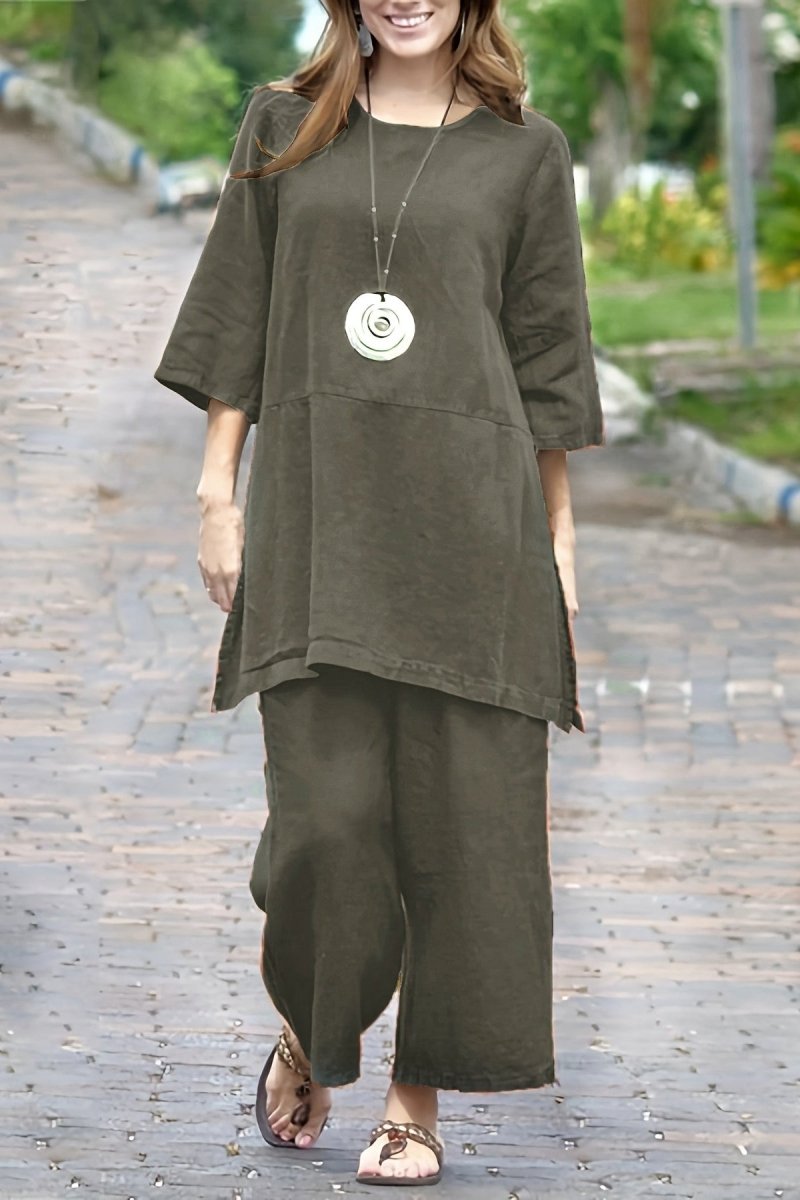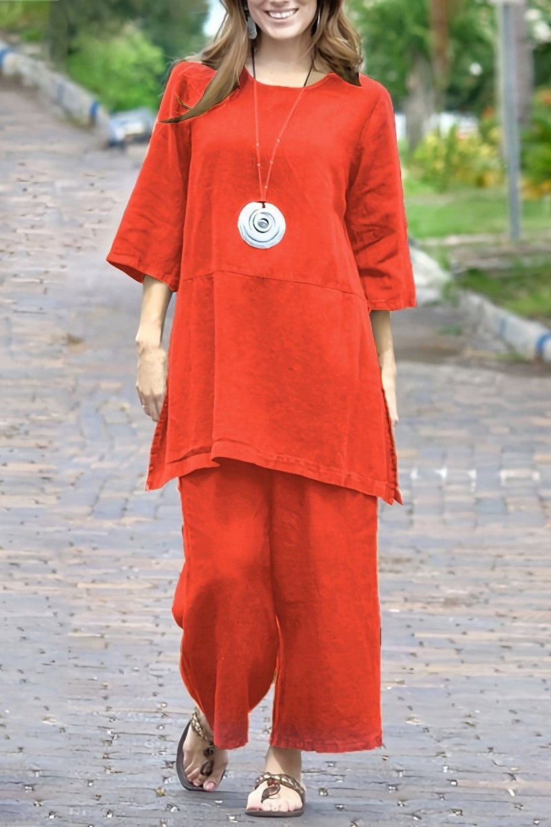 AUBRIANA – Plus Size Color-Block Linen Split Top & Wide-Leg Set