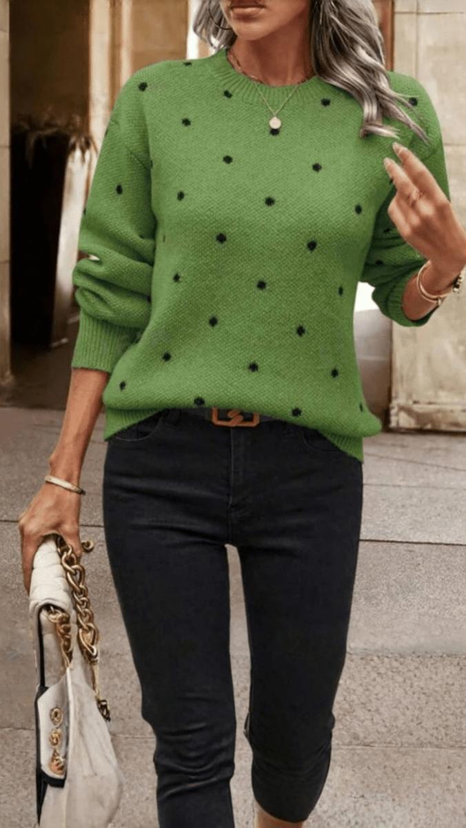The NOELLA Polka Dot Knit Sweater blends timeless pattern with effortless wearability. Designed with a relaxed silhouette and soft knit texture, it delivers comfort without compromising style. The subtle polka dot design adds a fresh, feminine touch to your everyday wardrobe.