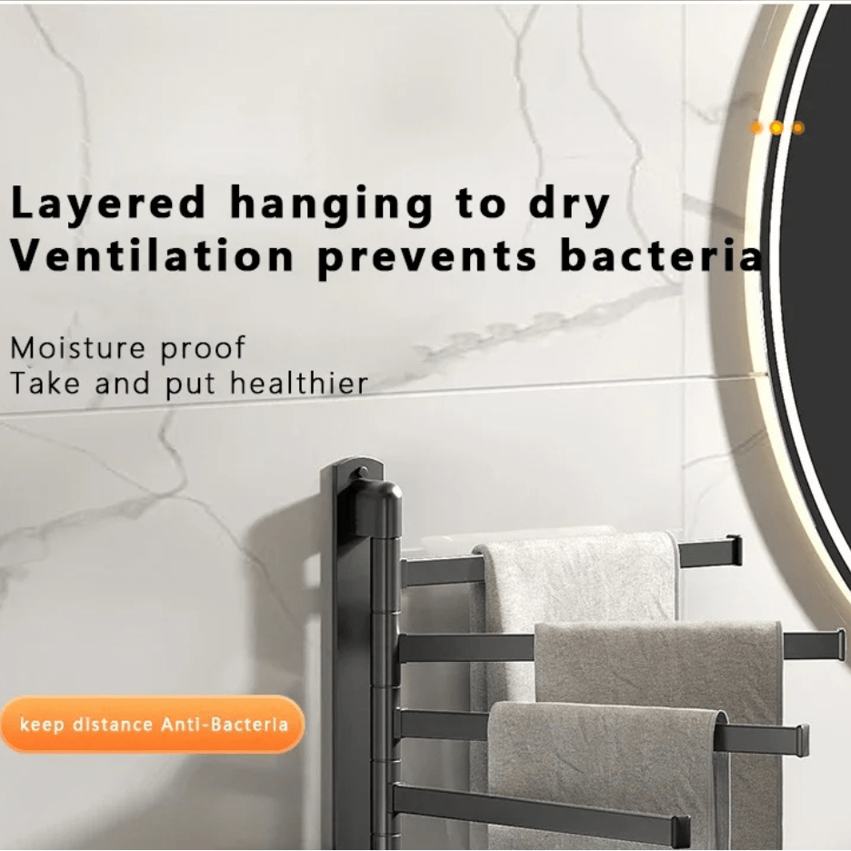 This modern matte black towel rack is designed to keep bathrooms organized with a stylish, space-saving approach. Featuring five rotatable arms, it allows multiple towels to hang separately for faster drying while maintaining a clean, minimalist look.